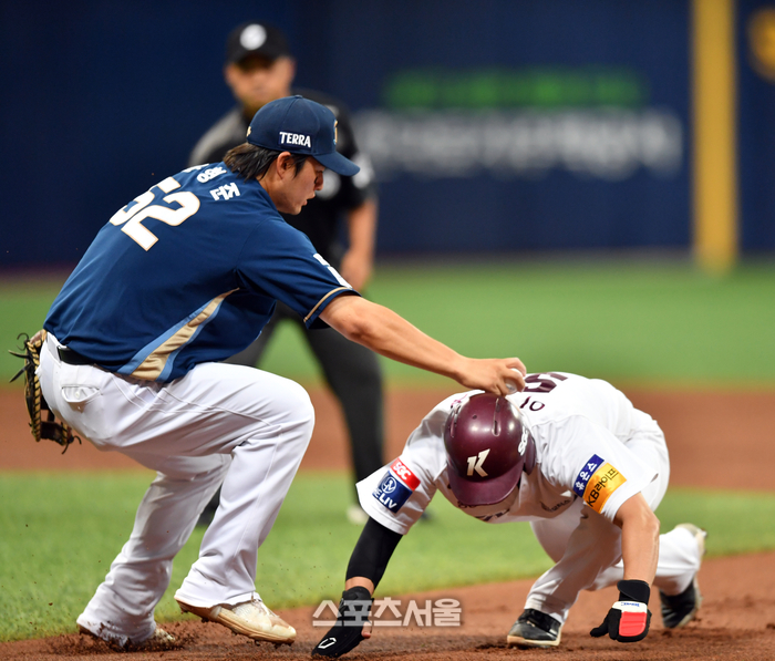 키움 7번타자 이지영이 5일 고척스카이돔에서 열린 2023 프로야구 키움히어로즈와 NC다이노스 경기 2회말 2사 8번타자 김수환 타석때 페디 견제구에 걸려 윤형준에 태그아웃되고 있다. 2023.07.05.