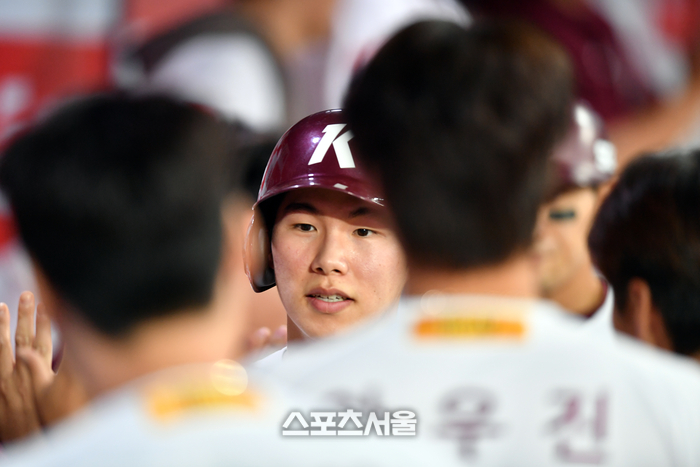 키움 4번타자 김웅빈이 5일 고척스카이돔에서 열린 2023 프로야구 키움히어로즈와 NC다이노스 경기 4회말 무사 2,3루에서 2타점 적시타를 터트렸다. 득점주자 이정후와 김혜성이 기분좋게 더그아웃으로 향하고 있다. 2023.07.05.