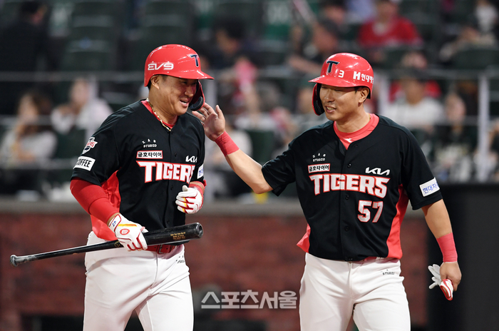 삼성에서 KIA로 트레이드 된 김태군(왼쪽)이 5일 인천 SSG랜더스필드에서 열린SSG와 경기 9회초 1사 만루 상황에서 1타점 희생플라이를 치고 고종욱과 하이파이브를 하고 있다. KIA 타이거즈는 5일 오전 내야수 류지혁을 삼성 라이온즈로 보내고 포수 김태군을 데리고 오는 1대1 트레이드를 단행했다. 2023. 7. 5. 문학 | 박진업기자 upandup@sportsseoul.com