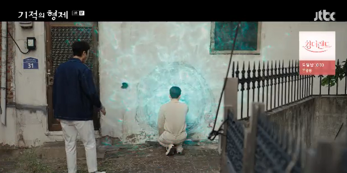 아이와 관련이 있는 듯한 그림을 보던 강산은 손을 갖다댔고 신비로운 푸른 빛이 벽을 따라 흘러나오는 가운데 강산은 그림 속 집으로 빨려들어갔다. 갑자기 강산이 사라지자 동주는 “야. 피해자, 어딨냐”라며 동네를 뛰어다녔다.
