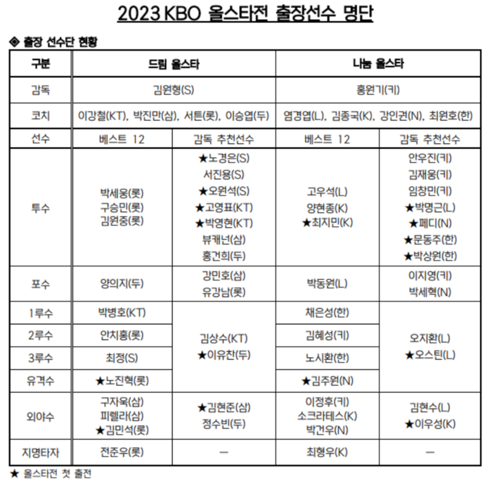 한국야구위원회(KBO)는 지난 4일 감독 추천 선수를 포함한 올스타전 천제 출전 명단을 발표했다. 지난주 팬과 선수 투표로 드림(SSG, KT, 삼성, 롯데, 두산)과 나눔(키움, LG, KIA, NC, 한화) 올스타 베스트 12가 확정됐다. 그리고 감독 추천 선수까지 총 50명의 2023시즌 올스타가 결정됐다.