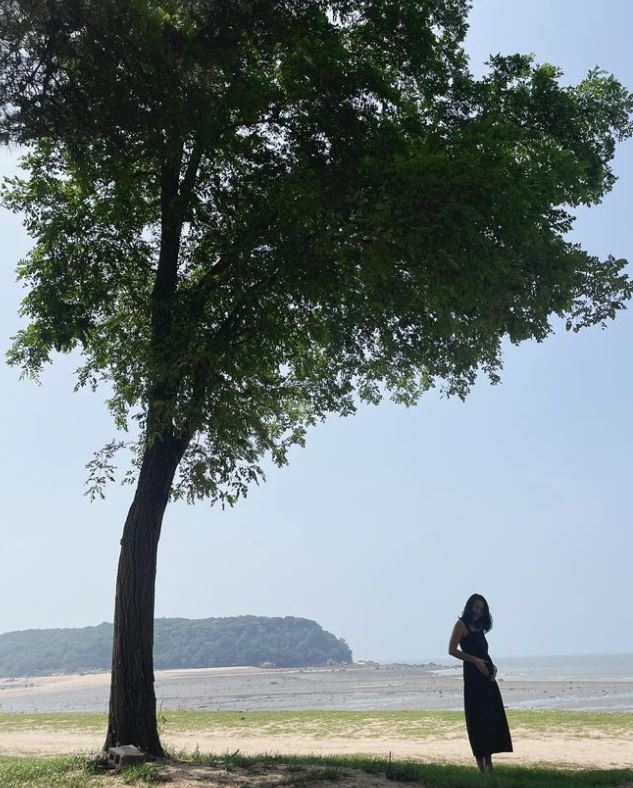 사진에는 해변에 있는 나무 아래에서 포즈를 취하고 있는 윤진서의 모습이 담겼다. 검은 원피스를 입고 살짝 나온 D라인이 눈길을 끈다.