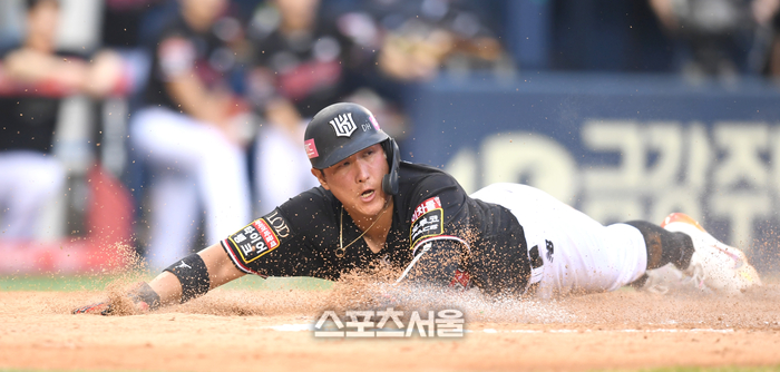 KT 황재균이 6일 잠실야구장에서 열린 2023 KBO리그 LG와 경기 4회초 1사1,3루 문상철 희생타 때 홈으로 파고들어 득점을 올리고 있다. 2023. 7. 6. 잠실 | 최승섭기자 thunder@sportsseoul.com
