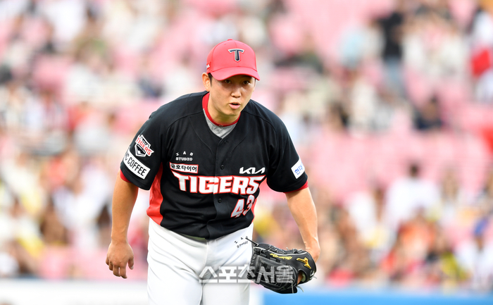 KIA 우완투수 김건국이 7일 수원KT위즈파크에서 열린 2023 프로야구 KT위즈와 KIA타이거즈의 경기 1회말 박병호의 머리를 맞춰 퇴장당해 당황해하고 있다. 2023.07.07.