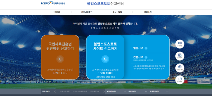 [스포츠서울 | 황혜정기자] 국민체육진흥공단에서 발행하는 체육진흥투표권 스포츠토토의 수탁사업자인 스포츠토토코리아가 시민들에게 불법스포츠토토 신고센터를 통한 적극적인 온라인 불법스포츠도박 사이트 제보 활동을 당부했다.