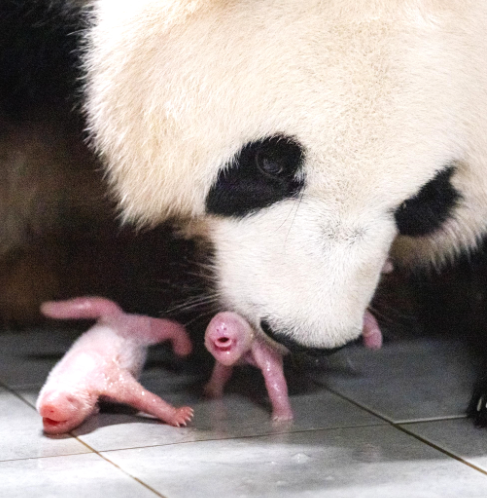 추가 사진에는 판다 아이바오가 막 출산한 쌍둥이 판다를 돌보고 있다.