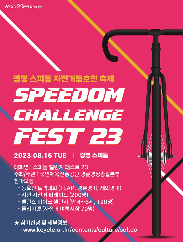 국민체육진흥공단 경륜경정총괄본부는 ‘스피돔 챌린지 페스트 23’의 부문별 참가자를 오는 14일부터 경륜 홈페이지 또는 온라인 포털을 통해 모집한다. ‘스피돔 챌린지 페스트 23’은 자전거 동호인과 어린이를 포함한 가족단위 시민 등이 행사장을 방문해 즐기는 참여형 페스티벌로 오는 8월 15일 광명스피돔(경륜본장)에서 개최할 예정이다.