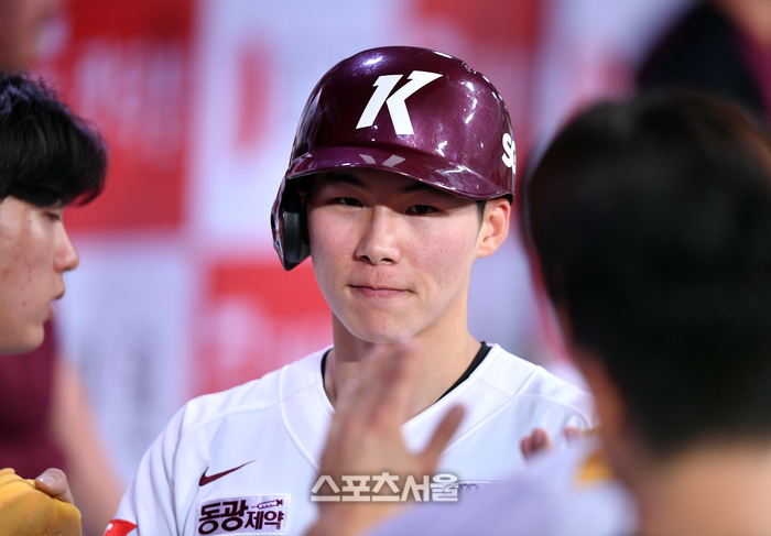 키움 2번타자 김혜성이 11일 고척스카이돔에서 열린 2023 프로야구 키움히어로즈와 KT위즈의 경기 4회말 1사 2,3루에서 임지열이 동점2루타를 터트리자 득점한 후 동료들과 자축하고 있다.. 2023.07.11.
