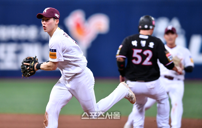 키움 2루수 김혜성이 11일 고척스카이돔에서 열린 2023 프로야구 키움히어로즈와 KT위즈의 경기 7회초 무사 1루 KT 5번 장성우의 땅볼을 잡아 1루로 송구하고 있다. 2023.07.11.