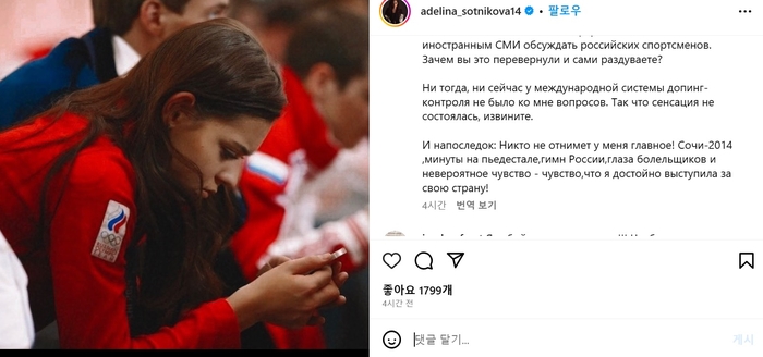 소트니코바는 12일(한국시간) 개인 소셜미디어를 통해 ‘지난주 내내 나와 우리 팀, 주변 사람들은 갑자기 부풀려진 미디어 보도에 대한 견해를 듣기 위해 엄청난 양의 전화와 메시지를 받았다’며 ‘난 이런 정보가 항상 인용되고 많은 조회수를 얻을 것임을 이해한다. 그러나 언론은 이미 내가 금지된 약물을 사용했다고 했다. 여러분, 그렇게 하면 안 되지 않느냐’며 날선 반응을 보였다.