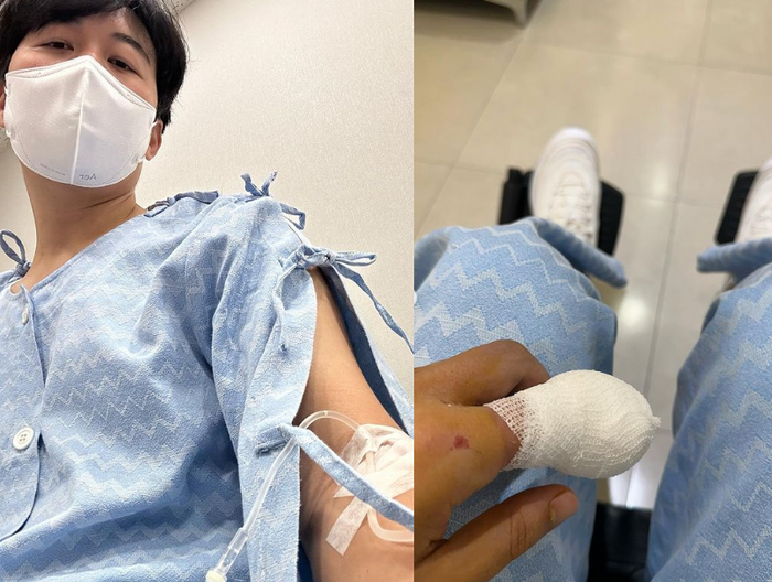 덧붙인 사진 속 도경완은 환자복을 입은 채 팔에 수액을 맡고 있다. 다른 사진에는 휠체어를 타고 있는 도경완이 손가락에 붕대를 감고 있다.