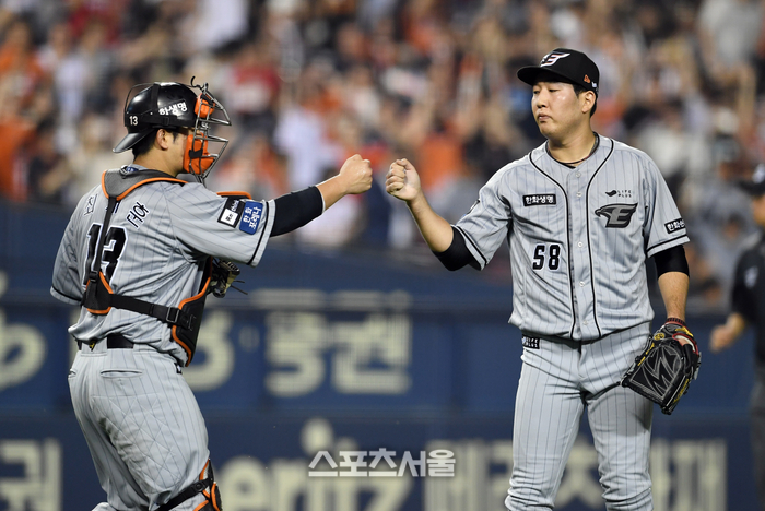 한화 이글스 박상원(오른쪽)이 12일 잠실구장에서 열린 2023 KBO리그 LG 트윈스와 경기 9회말 2사 1루 LG 문보경을 삼진아웃으로 잡아내며 승리를 지켜낸 뒤 포수 최재훈과 주먹을 맞대고 있다. 박상원은 1이닝을 무실점으로 막아내며 시즌 7세이브를 기록했다. 2023. 7. 12. 잠실 | 박진업기자 upandup@sportsseoul.com