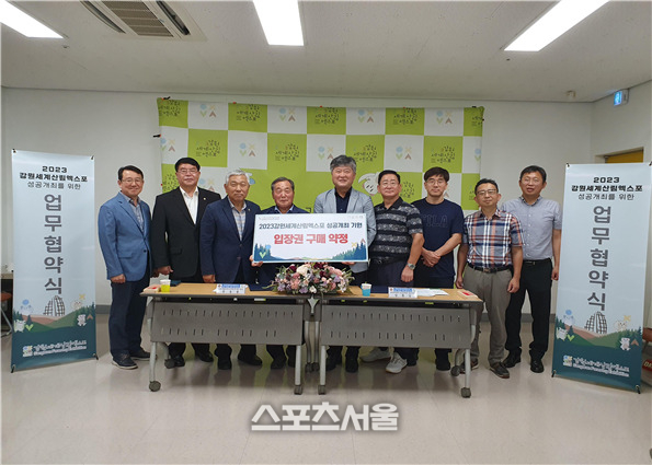 [스포츠서울ㅣ춘천=김기원 기자] (재)강원세계산림엑스포 조직위원회(위원장 김진태)는 13일 조직위원회 사무실(고성군 토성면 인흥리)에서 『2023 강원세계산림엑스포』 성공 개최를 위하여 강원특별자치도재향군인회(회장 권동용)와 업무협약을 체결하고, 입장권(5백만원) 사전구매 약정식을 진행했다.
