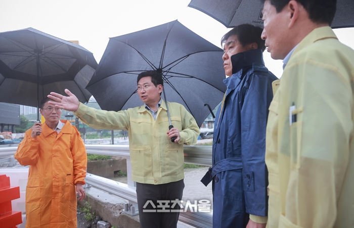 〔스포츠서울│용인=좌승훈기자〕이상일 용인시장은 13일 오후 비가 많이 내리자 수지구 동천동 고기교를 또다시 찾아 집중호우 대비 태세를 점검했다.