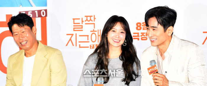 차인표가 14일 건대입구 롯데시네마에서 열린 영화 ‘달짝지근해:7510’ 제작보고회 무대에 올라 박경림과 인터뷰를 하고 있다. 유해진, 김희선, 차인표, 진선규, 한선화가 출연하는 ‘달짝지근해:7510’는 8월 15일 개봉예정이다. 2023.07.14.
