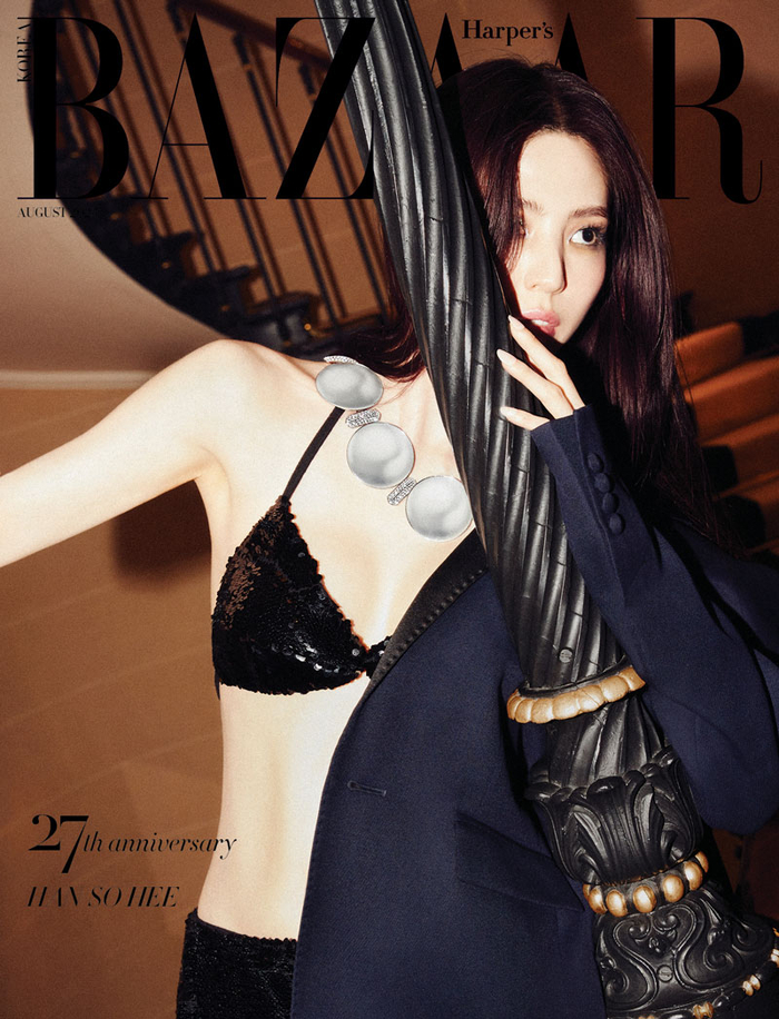 선공개된 8월호 커버에서 한소희는 은빛의 볼드한 주얼리를 목걸이와 헤어핀으로 착용해 독특한 분위기를 발산한다. 란제리 느낌의 의상과 와인 컬러의 스타킹까지 강렬한 이미지 변신이 눈길을 끈다.