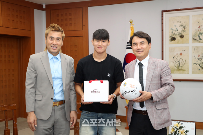 [스포츠서울ㅣ춘천=김기원 기자] 강원FC 구단주인 김진태 강원특별자치도지사는 17일 도청 통상상담실에서 스코틀랜드 명문 구단 셀틱FC로 이적하게 된 강원FC 양현준 선수를 만나 축하와 격려의 뜻을 전했다.