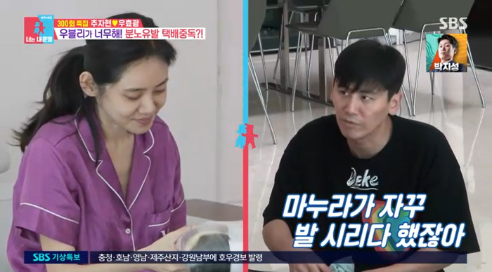 이날 우효광은 택배 중독 면모를 보였다. 알고 보니 아들을 위한 선물이었음이 밝혀졌다. 추자현에게는 한여름에 수면 양말을 선물했다. 우효광은 “자꾸 발 시리다 했잖아”라고 말해 웃음을 자아냈다.