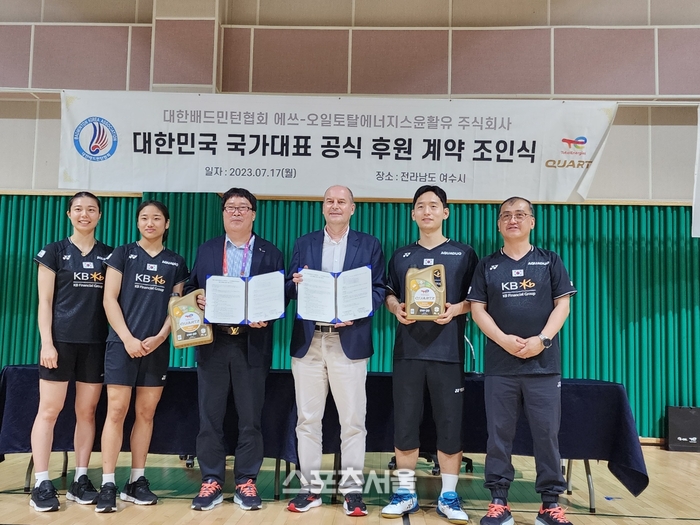 [스포츠서울 | 김경무전문기자] 대한배드민턴협회(회장 김택규)는 지난 17일 전남 여수시에서 배드민턴 국가대표 선수단과 에쓰-오일토탈에너지스윤활유주식회사의 후원계약 조인식을 했다고 밝혔다.