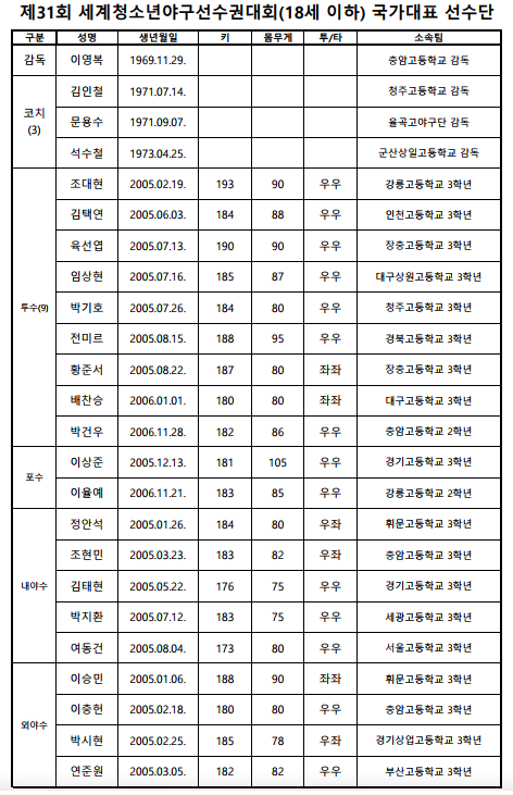 대한야구소프트볼협회(KBSA)는 오는 9월1일부터 10일까지 대만(타이베이, 타이중)에서 열리는 제31회 세계야구소프트볼연맹(WBSC) U-18 야구 월드컵(세계청소년야구선수권대회)에 출전할 대표팀 명단을 18일 발표했다.