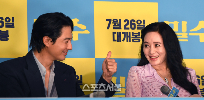 조인성이 18일 서울 CGV 용산아이파크몰에서 열린 영화 '밀수' 언론시사회에서 김혜수에 엄지척을 하고 있다. ‘밀수’는 바다에 던져진 생필품을 건지며 생계를 이어가던 사람들 앞에 일생일대의 큰 판이 벌어지며 휘말리는 해양범죄활극으로 26일 개봉 예정이다 2023. 7. 18. 최승섭기자 thunder@sportsseoul.com