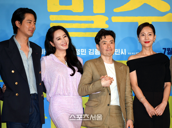 조인성, 김혜수, 류승완 감독, 염정아(왼쪽부터)가 18일 서울 CGV 용산아이파크몰에서 열린 영화 '밀수' 언론시사회에서 포토타임을 갖고 있다. ‘밀수’는 바다에 던져진 생필품을 건지며 생계를 이어가던 사람들 앞에 일생일대의 큰 판이 벌어지며 휘말리는 해양범죄활극으로 26일 개봉 예정이다 2023. 7. 18. 최승섭기자 thunder@sportsseoul.com