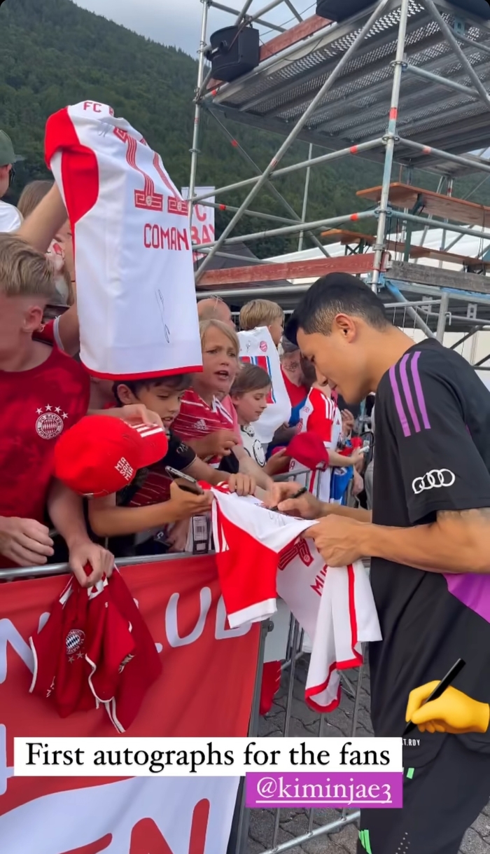 뮌헨은 이날 로타하 에건FC와 연습경기를 치렀다. 김민재는 따로 경기에 나서지 않았지만, 경기 종료 후 팬들은 ‘KIM’을 연호했다. 김민재에게 사인을 받으려는 팬들로 북적였다. 김민재도 팬들을 위해 유니폼과 모자 등에 정성스럽게 사인을 했다. 구단은 ‘팬을 위한 첫 번째 사인이다’라며 영상을 게재했다.