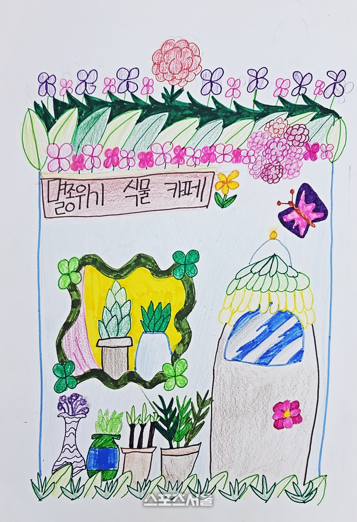 정지윤(강릉) 어린이의 작품 <멸종위기 식물 카페>는 숲속 카페 안에서 식물들이 함께 이야기를 나누길 바라는 마음이 담긴 그림으로, 소재의 참신함과 어린이의 순수함이 돋보여 좋은 반응을 얻었다.