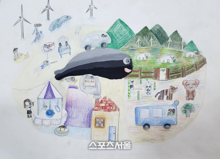 우예빈(평창) 어린이의 작품 <생각을 깨는 놀이공원>은 가까운 곳에 놀이공원이 생기길 바라는 마음이 담긴 그림으로, 어디든지 태워주는 고래와 핑크색 호랑이 등의 환상적인 요소로 시선을 사로잡았다.