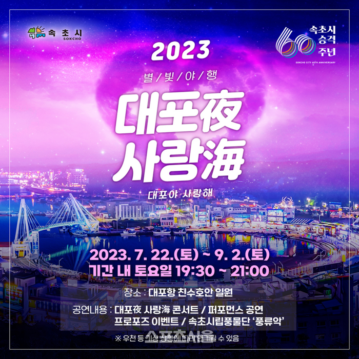 속초시는 대포항을 방문하는 시민과 관광객을 대상으로 오는 7월 22일부터 9월 2일까지 매주 토요일 「2023 별빛야행 대포夜 사랑海」를 진행한다.