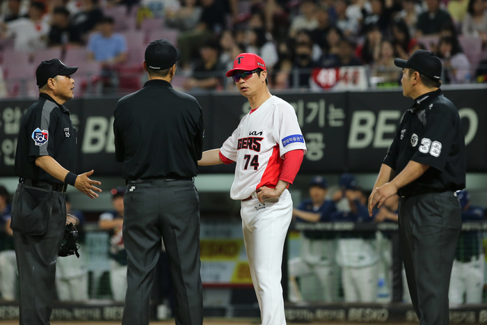 KIA에서 비디오 판독을 요청했다. 피렐라가 파울 라인 안쪽으로 뛰었다는 것이다. 그러나 판독 결과 세이프가 나왔다. ‘수비 방해’가 아니라 ‘애초에 악송구’였다는 심판의 판단. 김종국 감독이 강하게 항의했으나 바뀌는 것은 없었다.