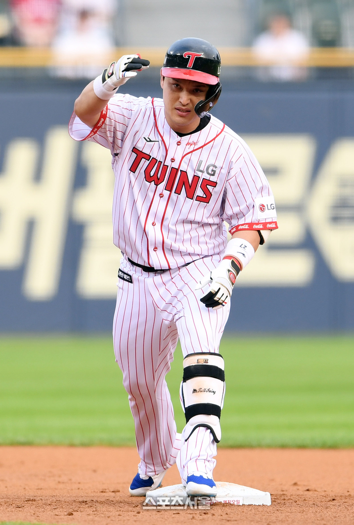 LG 트윈스 박동원이 21일 잠실구장에서 열린 2023 KBO리그 SSG 랜더스와 경기 1회말 2사 1루 상황에서 SSG 선발 투수 김광현을 상대로 2루타를 치고 세리머니를 하고 있다. 2023. 7. 21. 잠실 | 박진업기자 upandup@sportsseoul.com