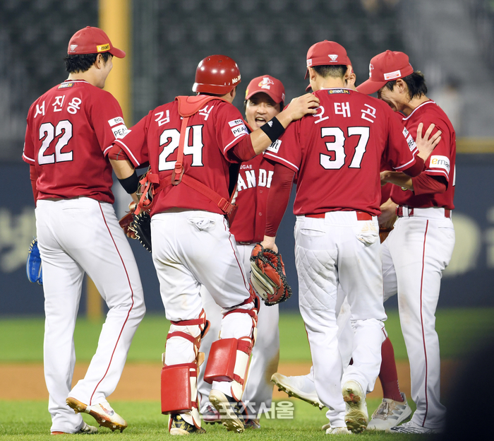 SSG 랜더스 선수들이 21일 잠실구장에서 열린 2023 KBO리그 LG 트윈스와 경기에서 승리한 뒤 발을 내밀며 세리머니를 하고 있다. 2023. 7. 21. 잠실 | 박진업기자 upandup@sportsseoul.com