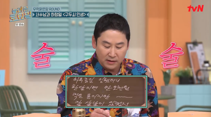 역대급 오래된 노래에 모두 멘붕에 빠진 가운데 신동엽만 조용히 미소지었다. 베일을 벗은 ‘구두쇠인생’은 빠른 비트에 엄청난 양의 가사가 흘러갔고, 첫 받아쓰기가 끝나자 곳곳에서 한숨이 터져나왔다.