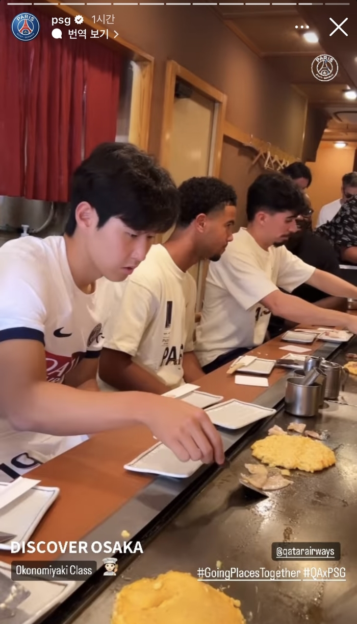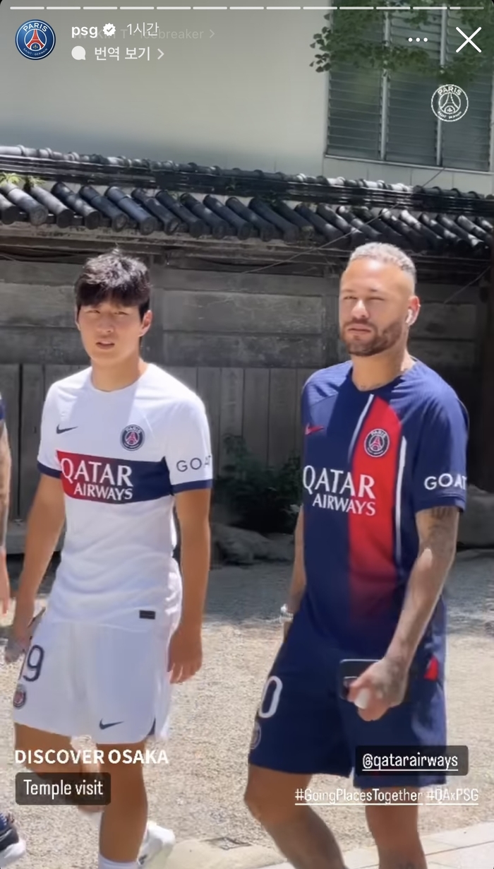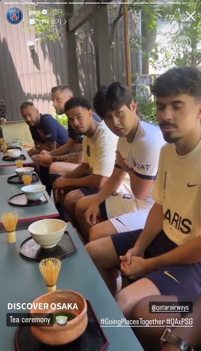 PSG가 24일 SNS를 통해 공개한 영상을 보면 이강인은 네이마르를 비롯한 팀 동료들과 조를 이뤄 일본 오사카 체험에 나섰다. 이날 이강인은 차를 마시고 일본 전통 음식인 오코노미야키를 만들어 먹는 시간을 보냈다. 사원도 방문해 기념사진을 찍는 등 일본 문화를 경험하는 모습이었다. 행사 내내 이강인은 네이마르와 밀착해 동행했다.