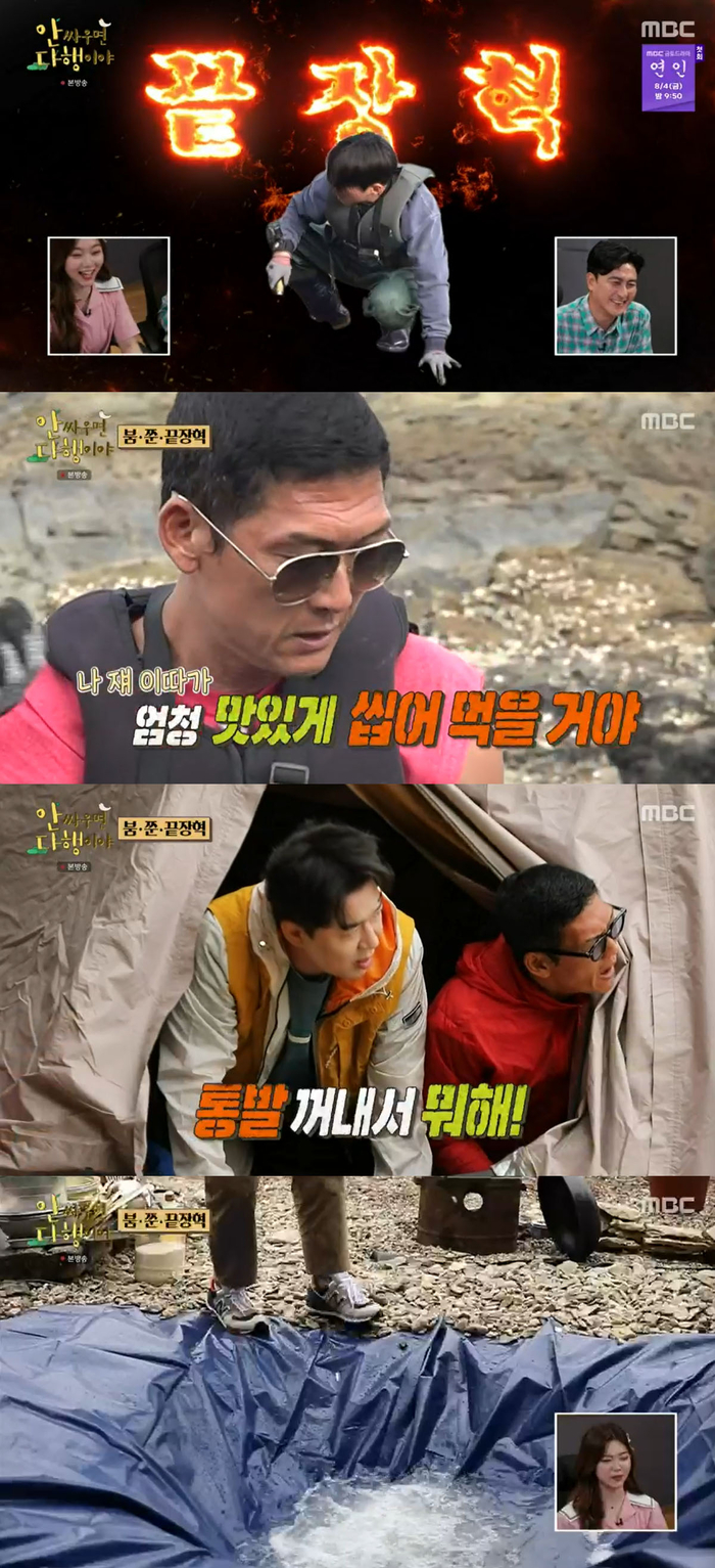 24일 방송된 MBC ‘안 싸우면 다행이야’에서 god 박준형, 배우 장혁, 방송인 붐이 함께한 섬여행 둘째날이 그려졌다. 텐트에서 찌뿌둥한 아침을 맞은 박준형과 붐은 사라진 장혁의 행방에 당황했다.