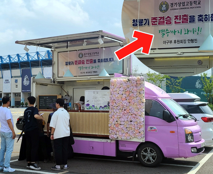 사진은 경기상고 야구부 안형진 후원회장이 ‘청룡기 준결승 진출’을 축하하며 목동구장으로 보낸 커피차 모습이다. kenny@sportsseoul.com