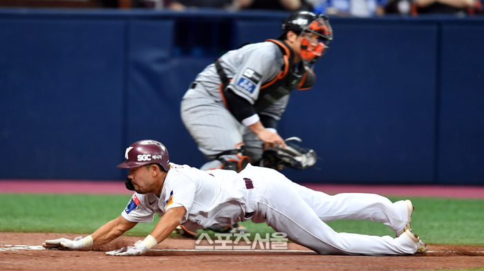 키움 1번타자 이용규가 25일 고척스카이돔에서 열린 2023 프로야구 키움히어로즈와 한화이글스의 경기 3회말 무사 만루 3번타자 이원석 3루수 파울플라이때 3루에서 과감하게 홈을 파고들고 있다.2023.07.25.