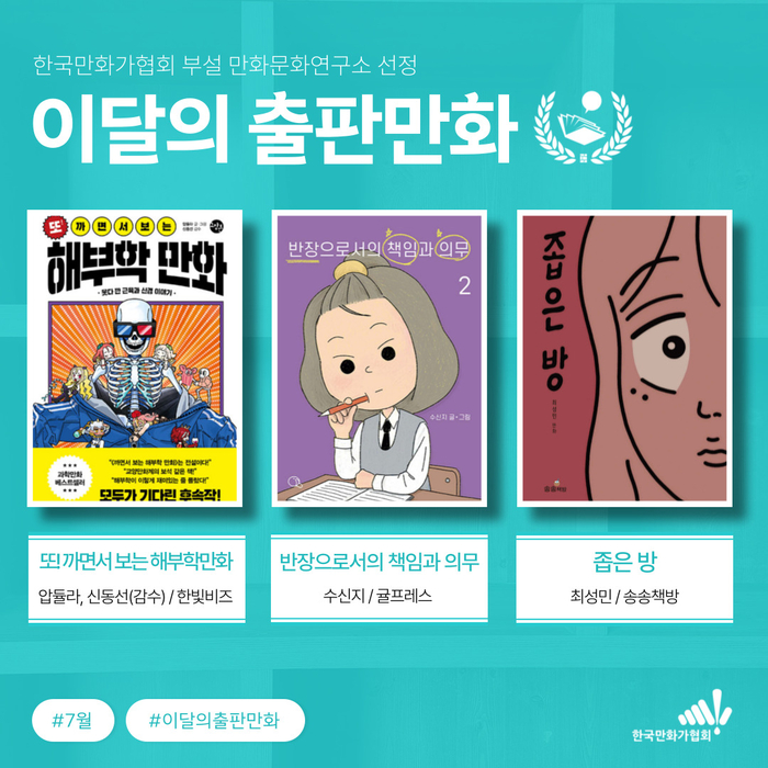만화문화연구소가 선정한 이달의 출판만화는 ‘또! 까면서 보는 해부학 만화’, ‘반장으로서의 책임과 의무’, ‘좁은 방’ 등 3편이다.