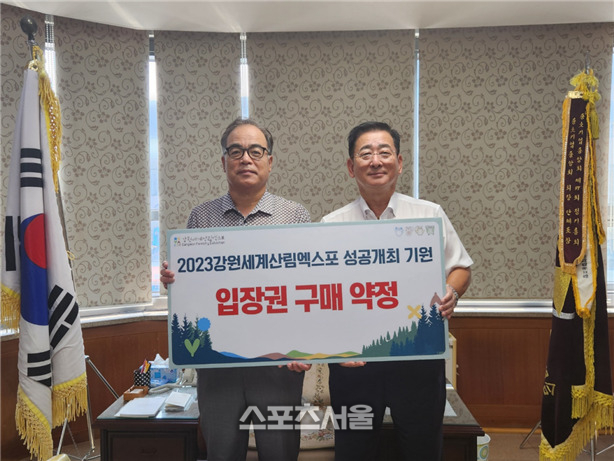 [스포츠서울ㅣ춘천=김기원 기자] (재)강원세계산림엑스포조직위원회(조직위원장 김진태)는 7월 26일(수) ‘2023 강원세계산림엑스포’ 성공개최를 기원하며 강원도레미콘공업협동조합(이사장 이성열)에서 입장권(3백 50만원)을 구매했다고 전했다.