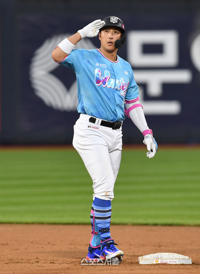 KT 위즈 황재균이 26일 수원 KT 위즈파크에서 열린 2023 KBO리그 LG 트윈스와 경기 4회말 무사 LG 선발 임찬규를 상대로 2루타를 치고 세리머니를 하고 있다. 2회말에 이어 황재균의 연타석 2루타. 2023. 7. 26. 수원 | 박진업기자 upandup@sportsseoul.com
