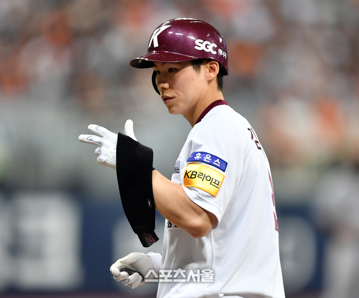 키움 2번타자 김혜성이 26일 고척스카이돔에서 열린 2023 프로야구 키움히어로즈와 한화이글스의 경기 8회말 무사에서 안타로 출루하고 있다. 2023.07.26.