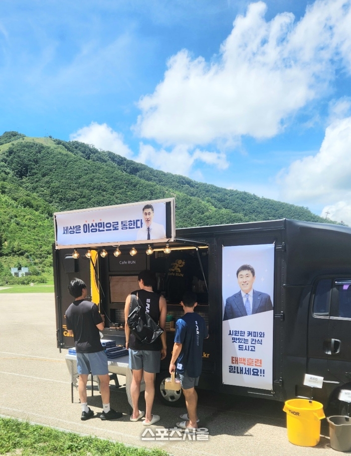 두 번째 커피차가 27일 태백 오투리조트에 나타났다. 이 코치를 응원하는 팬들이 더운 여름 고생하는 선수단, 코칭스태프, 사무국을 위해 준비했다. ‘세상은 이상민으로 통한다’, ‘태백훈련 힘내세요!’라는 문구가 크게 적혀있었다.