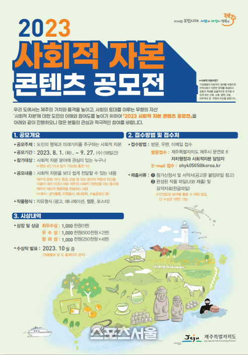 [스포츠서울ㅣ제주=김기원 기자] 제주특별자치도는 도민사회의 토대를 이루는 무형의 자산인 사회적 자본에 대한 도민의 이해와 참여도를 높이기 위해 ‘도민의 행복과 미래가치를 추구하는 사회적 자본’을 주제로 콘텐츠를 공모한다고 밝혔다.