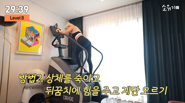 레벨을 8로 맞춘 소유는 “1분도 안됐는데 벌써 온다. 그래도 유산소를 꾸준히 해줘야 결과적으로 체지방이 빠지기 때문에”라며 “엉덩이에 더 자극을 주시기 위해서는 약간 뒤꿈치로 엉덩이로 눌러준다는 느낌으로 타주면 된다”고 설명했다.