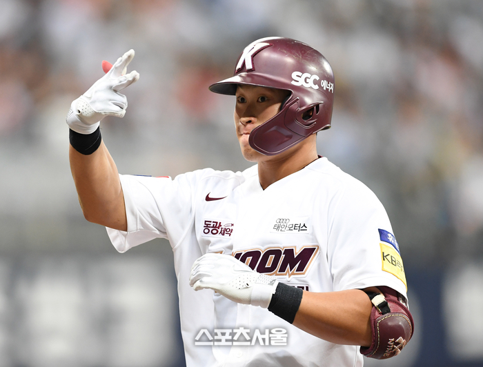 키움 히어로즈 주성원이 27일 고척스카이돔에서 열린 2023 KBO리그 한화 이글스와 경기 4회말 1사 1루 상황에서 한화 선발투수 산체스를 상대로 안타를 치고 세리머니를 하고 있다. 2023. 7. 27. 고척 | 박진업기자 upandup@sportsseoul.com