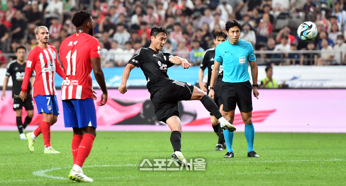 팀K리그 백승호가 27일 서울월드컵경기장에서 열린 쿠팡플레이 시리즈 팀K리그(K리그 올스타)와 아틀레티코 마드리드와의 친선경기에서 발리슛을 시도하고 있다. 2023.07.27.