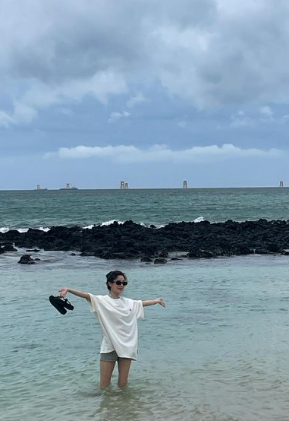 사진에는 바닷가를 찾은 이다인의 모습이 담겼다. 커다란 티셔츠를 입은 이다인은 즐거운 듯 바닷속에서 양팔을 활짝 벌리고 있다.