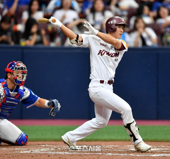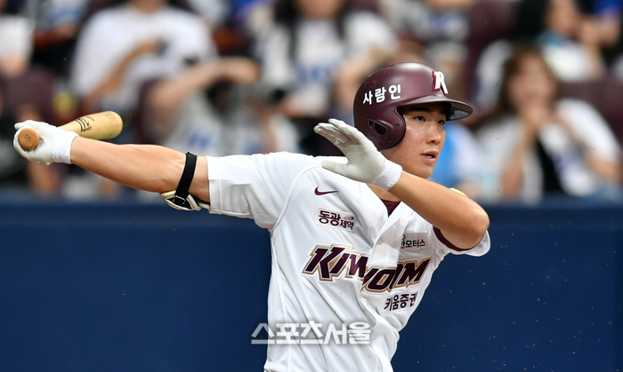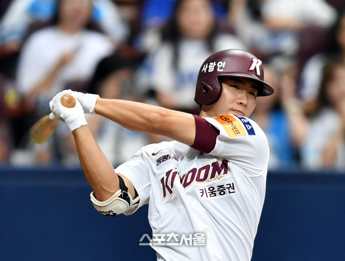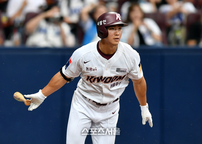 키움 6번타자 이주형이 30일 고척스카이돔에서 열린 2023 프로야구 키움히어로즈와 삼성라이온즈의 경기 2회말 무사 1루에서 내야땅볼로 출루하고 있다. 이주형은 우승을 노리는 LG가 최원태의 1:3 트레이드 카드로 전격 키움으로 이적해 이틀연속 선발출전하고 있다.2023.07.30.