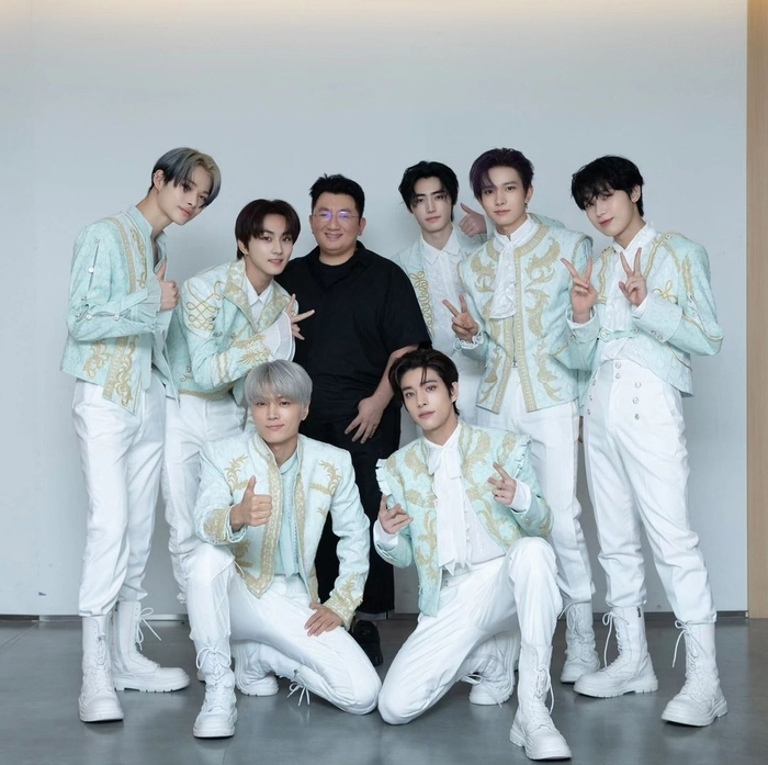 공개된 사진에는 엔하이픈 멤버들과 함께 포즈를 취한 방시혁의 모습이 담겼다.